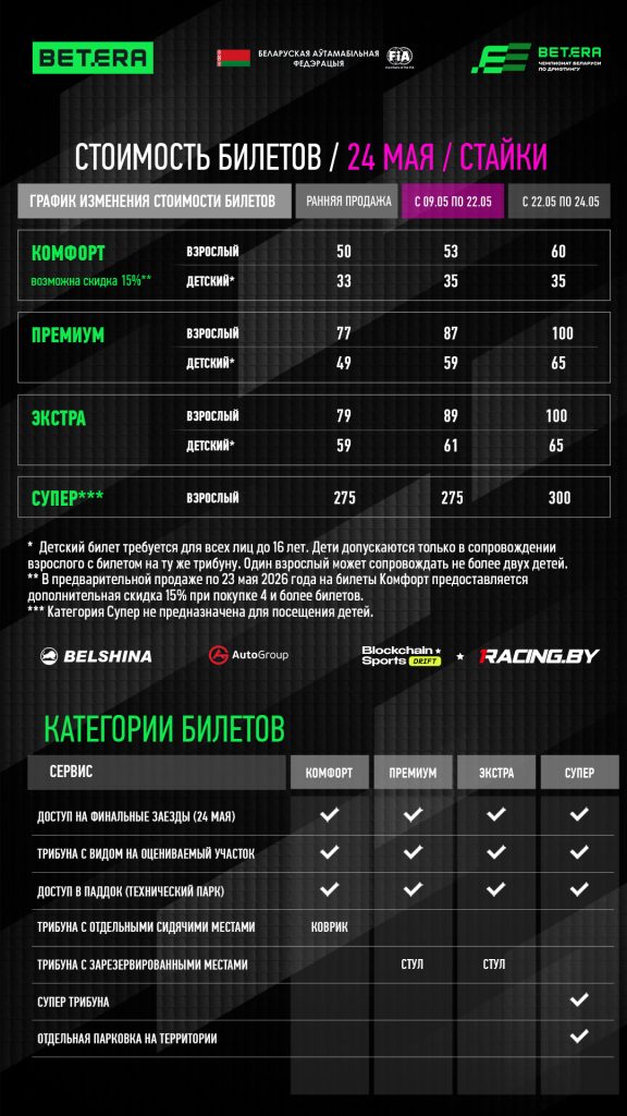 BETERA и организаторы Чемпионата Беларуси по дрифтингу реализуют совместные проекты с 2019 года. Начав с титульного партнерства, компания закрепилась в качестве надежного соорганизатора главных дрифт-событий страны. Сегодня BETERA является генеральным партнером Чемпионата Беларуси по дрифтингу, который с 2025 года в официальных календарях и протоколах именуется **Betera Чемпионат Беларуси по дрифтингу**.